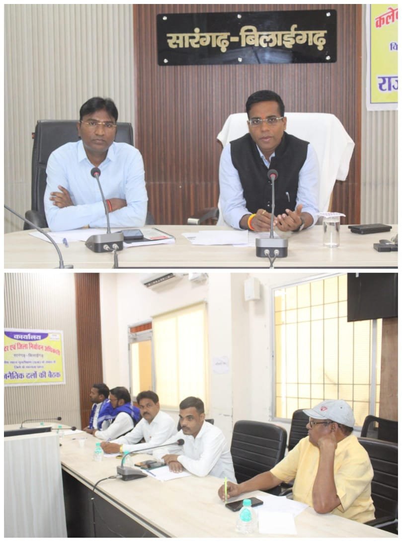 सारंगढ़ बिलाईगढ़, 21 नवंबर 2025:  कलेक्टर एवं जिला निर्वाचन अधिकारी डॉ संजय कन्नौजे ने कलेक्ट्रेट सभाकक्ष में राजनीतिक दलों की बैठक लेकर एसआईआर के प्रगति के संबंध में विस्तृत जानकारी दिए। जिला निर्वाचन अधिकारी ने कहा कि, विशेष गहन पुनरीक्षण के दौरान बूथ लेवल अधिकारी (बीएलओ) द्वारा घर-घर जाकर गणना फार्म वितरित कर रहे हैं और प्राप्त गणना फार्म पर अपने अभिमत के साथ आयोग के पोर्टल पर अपलोड कर रहे हैं। कलेक्टर ने कहा कि विशेष गहन पुनरीक्षण कार्य एक बड़ी प्रक्रिया है और पूरी तरह से पारदर्शी है। अपने बूथ स्तरीय एजेंट (बीएलए) नियुक्त करें और इस कार्य में बीएलओ को पूरा सहयोग दें। बैठक में उप जिला निर्वाचन अधिकारी प्रकाश सर्वे, भारतीय जनता पार्टी से आकाश ठाकुर, कांग्रेस पार्टी से राधेलाल जायसवाल, बहुजन समाज पार्टी से रमेश अनंत, दयाराम खुराना, शिव प्रसाद भास्कर, जनता कांग्रेस छत्तीसगढ़ (जोगी) से विकास टंडन, आप से नंदकुमार उपस्थित थे।