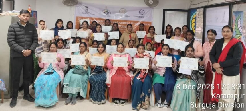 छत्तीसगढ़ में महिला उद्यमिता को बढ़ावा देने के उद्देश्य से छत्तीसगढ़ राज्य औद्योगिक विकास निगम (CSIDC) के सहयोग से रैंप योजना (Raising and Accelerating MSME Performance) के अंतर्गत सूरजपुर जिले में महिलाओं के लिए 15 दिवसीय एंटरप्रेन्योरशिप डेवलपमेंट प्रशिक्षण का सफल आयोजन किया गया। यह कार्यक्रम अभिनव इंस्टीट्यूट ऑफ मैनेजमेंट द्वारा ग्राम केनापारा, विकासखंड सूरजपुर में 21 नवंबर से 7 दिसंबर 2025 तक संचालित हुआ।